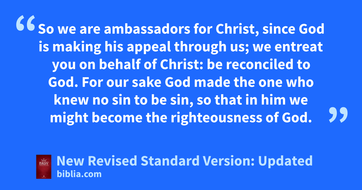 16 From now on, therefore, we regard no one from a human point of view;t even though we once knew Christ from a human point of view,u we no longer know him in that way.* 17 So if anyone is in Christ, therev is a new creation: everything old has passed away; look, new things have come into being!w,* 18 All this is from God, who reconciled us to himself through Christ and has given us the ministry of reconciliation;* 19 that is, in Christ God was reconciling the world to himself,x not counting their trespasses against them, and entrusting the message of reconciliation to us.* 20 So we are ambassadors for Christ, since God is making his appeal through us; we entreat you on behalf of Christ: be reconciled to God.* 21 For our sake God made the one who knew no sin to be sin, so that in him we might become the righteousness of God.*