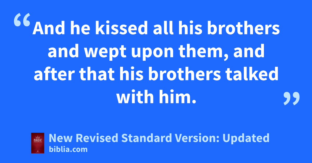 4 Then Joseph said to his brothers, “Come closer to me.” And they came closer. He said, “I am your brother, Joseph, whom you sold into Egypt.* 5 And now do not be distressed or angry with yourselves because you sold me here, for God sent me before you to preserve life.* 6 For the famine has been in the land these two years, and there are five more years in which there will be neither plowing nor harvest. 7 God sent me before you to preserve for you a remnant on earth and to keep alive for you many survivors. 8 So it was not you who sent me here but God; he has made me a father to Pharaoh and lord of all his house and ruler over all the land of Egypt.* 9 Hurry and go up to my father and say to him, ‘Thus says your son Joseph, God has made me lord of all Egypt; come down to me; do not delay. 10 You shall settle in the land of Goshen, and you shall be near me, you and your children and your children’s children, as well as your flocks, your herds, and all that you have.* 11 I will provide for you there, since there are five more years of famine to come, so that you and your household and all that you have will not come to poverty.’ 12 And now your eyes and the eyes of my brother Benjamin see that it is my own mouth that speaks to you. 13 You must tell my father how greatly I am honored in Egypt and all that you have seen. Hurry and bring my father down here.”* 14 Then he fell upon his brother Benjamin’s neck and wept, while Benjamin wept upon his neck. 15 And he kissed all his brothers and wept upon them, and after that his brothers talked with him.