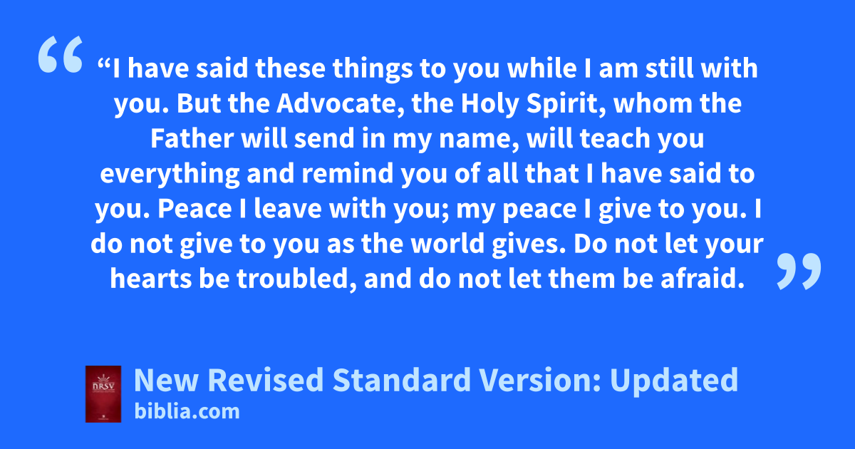 25 “I have said these things to you while I am still with you. 26 But the Advocate,f the Holy Spirit, whom the Father will send in my name, will teach you everything and remind you of all that I have said to you.* 27 Peace I leave with you; my peace I give to you. I do not give to you as the world gives. Do not let your hearts be troubled, and do not let them be afraid.* 28 You heard me say to you, ‘I am going away, and I am coming to you.’ If you loved me, you would rejoice that I am going to the Father, because the Father is greater than I.* 29 And now I have told you this before it occurs, so that when it does occur you may believe. 30 I will no longer talk much with you, for the ruler of this world is coming. He has no power over me,* 31 but I do as the Father has commanded me, so that the world may know that I love the Father. Rise, let us be on our way.*