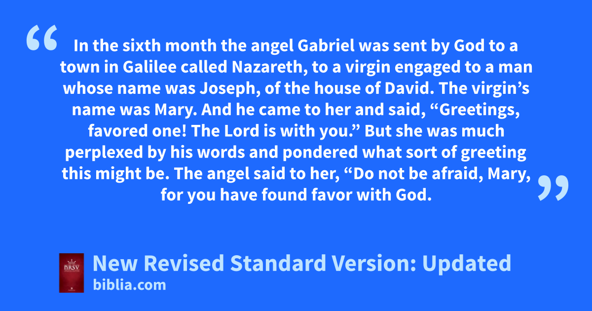 26 In the sixth month the angel Gabriel was sent by God to a town in Galilee called Nazareth,* 27 to a virgin engaged to a man whose name was Joseph, of the house of David. The virgin’s name was Mary.* 28 And he came to her and said, “Greetings, favored one! The Lord is with you.”b,* 29 But she was much perplexed by his words and pondered what sort of greeting this might be. 30 The angel said to her, “Do not be afraid, Mary, for you have found favor with God. 31 And now, you will conceive in your womb and bear a son, and you will name him Jesus.* 32 He will be great and will be called the Son of the Most High, and the Lord God will give to him the throne of his ancestor David.* 33 He will reign over the house of Jacob forever, and of his kingdom there will be no end.”* 34 Mary said to the angel, “How can this be, since I am a virgin?”c 35 The angel said to her, “The Holy Spirit will come upon you, and the power of the Most High will overshadow you; therefore the child to be bornd will be holy; he will be called Son of God.* 36 And now, your relative Elizabeth in her old age has also conceived a son, and this is the sixth month for her who was said to be barren. 37 For nothing will be impossible with God.”* 38 Then Mary said, “Here am I, the servant of the Lord; let it be with me according to your word.” Then the angel departed from her.
