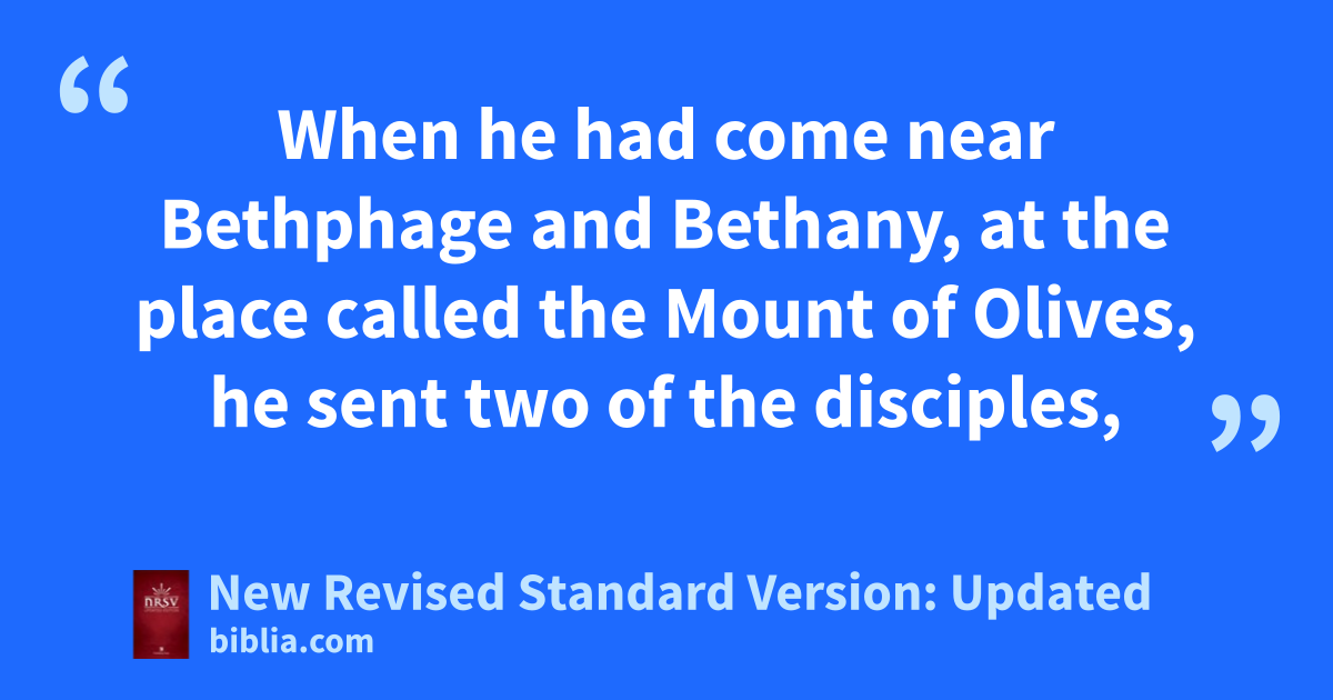 29 When he had come near Bethphage and Bethany, at the place called the Mount of Olives, he sent two of the disciples, 30 saying, “Go into the village ahead of you, and as you enter it you will find tied there a colt that has never been ridden. Untie it and bring it here. 31 If anyone asks you, ‘Why are you untying it?’ just say this, ‘The Lord needs it.’ ” 32 So those who were sent departed and found it as he had told them.* 33 As they were untying the colt, its owners asked them, “Why are you untying the colt?” 34 They said, “The Lord needs it.” 35 Then they brought it to Jesus, and after throwing their cloaks on the colt, they set Jesus on it. 36 As he rode along, people kept spreading their cloaks on the road.* 37 Now as he was approaching the path down from the Mount of Olives, the whole multitude of the disciples began to praise God joyfully with a loud voice for all the deeds of power that they had seen, 38 saying,