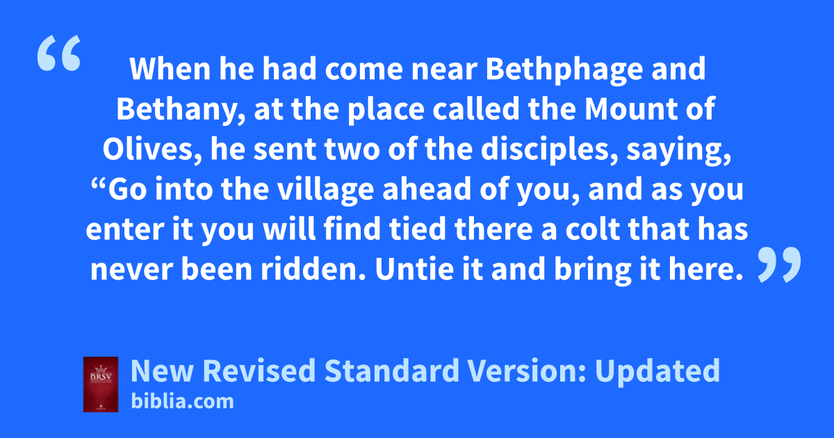 29 When he had come near Bethphage and Bethany, at the place called the Mount of Olives, he sent two of the disciples, 30 saying, “Go into the village ahead of you, and as you enter it you will find tied there a colt that has never been ridden. Untie it and bring it here. 31 If anyone asks you, ‘Why are you untying it?’ just say this, ‘The Lord needs it.’ ” 32 So those who were sent departed and found it as he had told them.* 33 As they were untying the colt, its owners asked them, “Why are you untying the colt?” 34 They said, “The Lord needs it.” 35 Then they brought it to Jesus, and after throwing their cloaks on the colt, they set Jesus on it. 36 As he rode along, people kept spreading their cloaks on the road.* 37 Now as he was approaching the path down from the Mount of Olives, the whole multitude of the disciples began to praise God joyfully with a loud voice for all the deeds of power that they had seen, 38 saying,