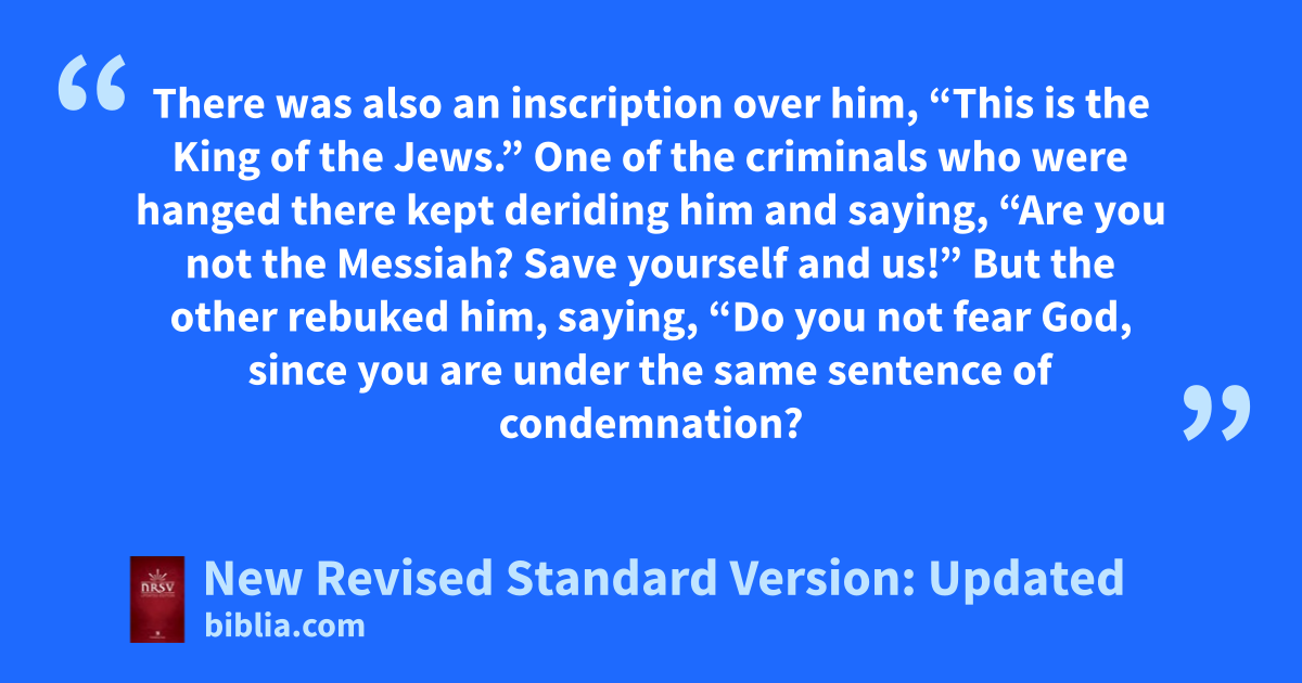 39 One of the criminals who were hanged there kept deridingz him and saying, “Are you not the Messiah?a Save yourself and us!”* 40 But the other rebuked him, saying, “Do you not fear God, since you are under the same sentence of condemnation? 41 And we indeed have been condemned justly, for we are getting what we deserve for our deeds, but this man has done nothing wrong.”* 42 Then he said, “Jesus, remember me when you come inb your kingdom.” 43 He replied, “Truly I tell you, today you will be with me in paradise.”*