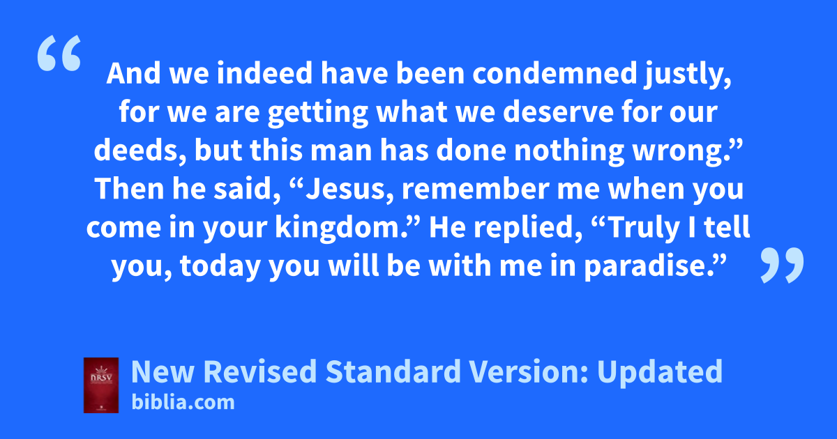 39 One of the criminals who were hanged there kept deridingz him and saying, “Are you not the Messiah?a Save yourself and us!”* 40 But the other rebuked him, saying, “Do you not fear God, since you are under the same sentence of condemnation? 41 And we indeed have been condemned justly, for we are getting what we deserve for our deeds, but this man has done nothing wrong.”* 42 Then he said, “Jesus, remember me when you come inb your kingdom.” 43 He replied, “Truly I tell you, today you will be with me in paradise.”*