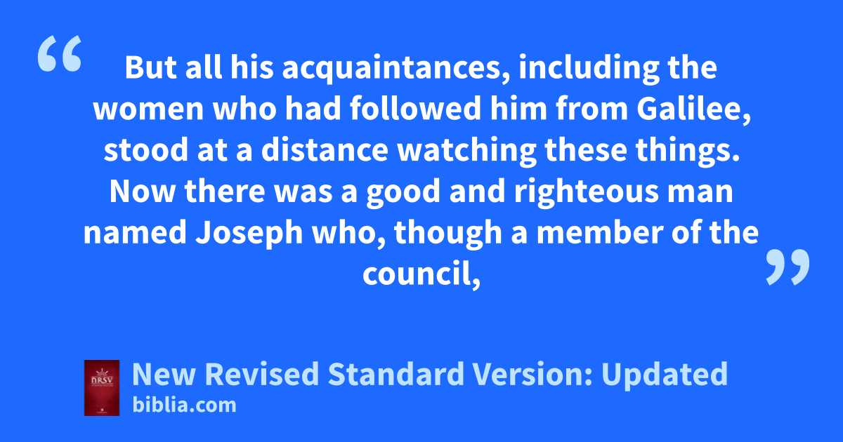 50 Now there was a good and righteous man named Joseph who, though a member of the council, 51 had not agreed to their plan and action. He came from the Jewish town of Arimathea, and he was waiting expectantly for the kingdom of God.* 52 This man went to Pilate and asked for the body of Jesus. 53 Then he took it down, wrapped it in a linen cloth, and laid it in a rock-hewn tomb where no one had ever been laid. 54 It was the day of Preparation, and the Sabbath was beginning.f,* 55 The women who had come with him from Galilee followed, and they saw the tomb and how his body was laid.* 56 Then they returned and prepared spices and ointments.