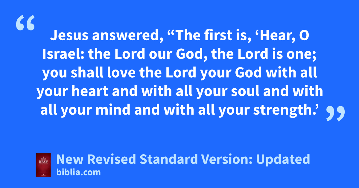 28 One of the scribes came near and heard them disputing with one another, and seeing that he answered them well he asked him, “Which commandment is the first of all?”* 29 Jesus answered, “The first is, ‘Hear, O Israel: the Lord our God, the Lord is one;* 30 you shall love the Lord your God with all your heart and with all your soul and with all your mind and with all your strength.’ 31 The second is this, ‘You shall love your neighbor as yourself.’ There is no other commandment greater than these.”* 32 Then the scribe said to him, “You are right, Teacher; you have truly said that ‘he is one, and besides him there is no other’;* 33 and ‘to love him with all the heart and with all the understanding and with all the strength’ and ‘to love one’s neighbor as oneself’—this is much more important than all whole burnt offerings and sacrifices.”* 34 When Jesus saw that he answered wisely, he said to him, “You are not far from the kingdom of God.” After that no one dared to ask him any question.*