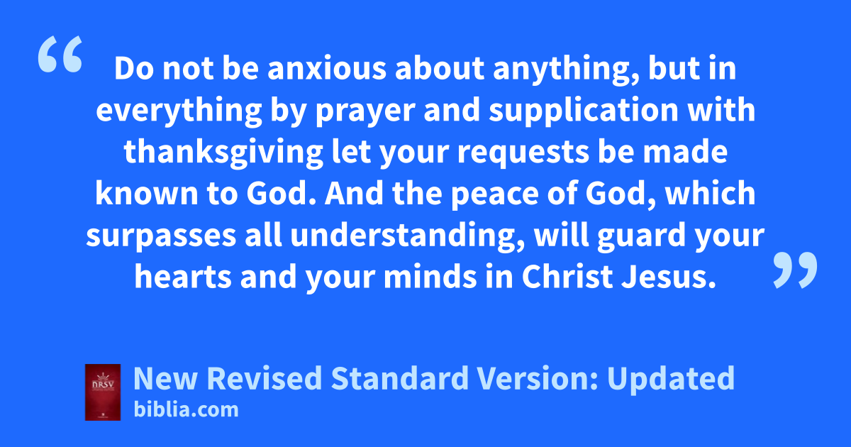4 Rejoicea in the Lord always; again I will say, Rejoice.b,* 5 Let your gentleness be known to everyone. The Lord is near.* 6 Do not be anxious about anything, but in everything by prayer and supplication with thanksgiving let your requests be made known to God.* 7 And the peace of God, which surpasses all understanding, will guard your hearts and your minds in Christ Jesus.*