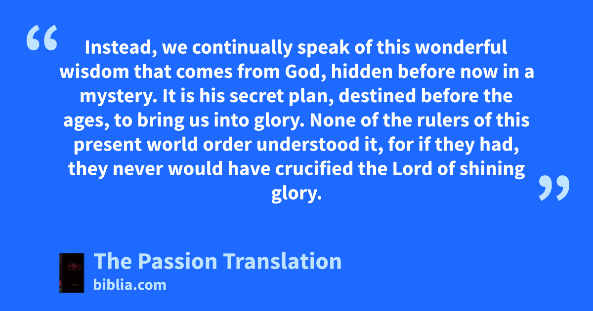Instead, we continually speak of this wonderful wisdom that comes from God, hidden before now in a mystery. It is his secret plan, destined before the ages, to bring us into glory. None of the rulers of this present world order understood it, for if they had, they never would have crucified the Lord of shining glory.