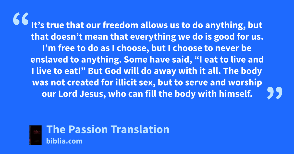 It’s true that our freedom allows us to do anything, but that doesn’t mean that everything we do is good for us. I’m free to do as I choose, but I choose to never be enslaved to anything. Some have said, “I eat to live and I live to eat!” But God will do away with it all. The body was not created for illicit sex, but to serve and worship our Lord Jesus, who can fill the body with himself.