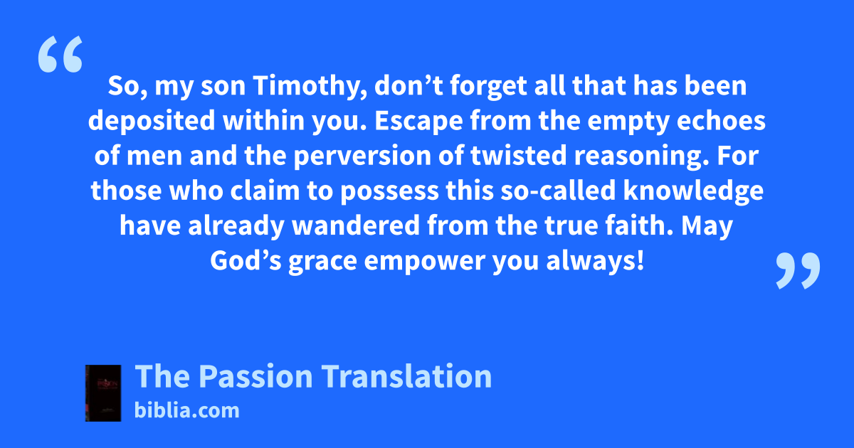 So, my son Timothy, don’t forget all that has been deposited within you. Escape from the empty echoes of men and the perversion of twisted reasoning. For those who claim to possess this so-called knowledge have already wandered from the true faith. May God’s grace empower you always!