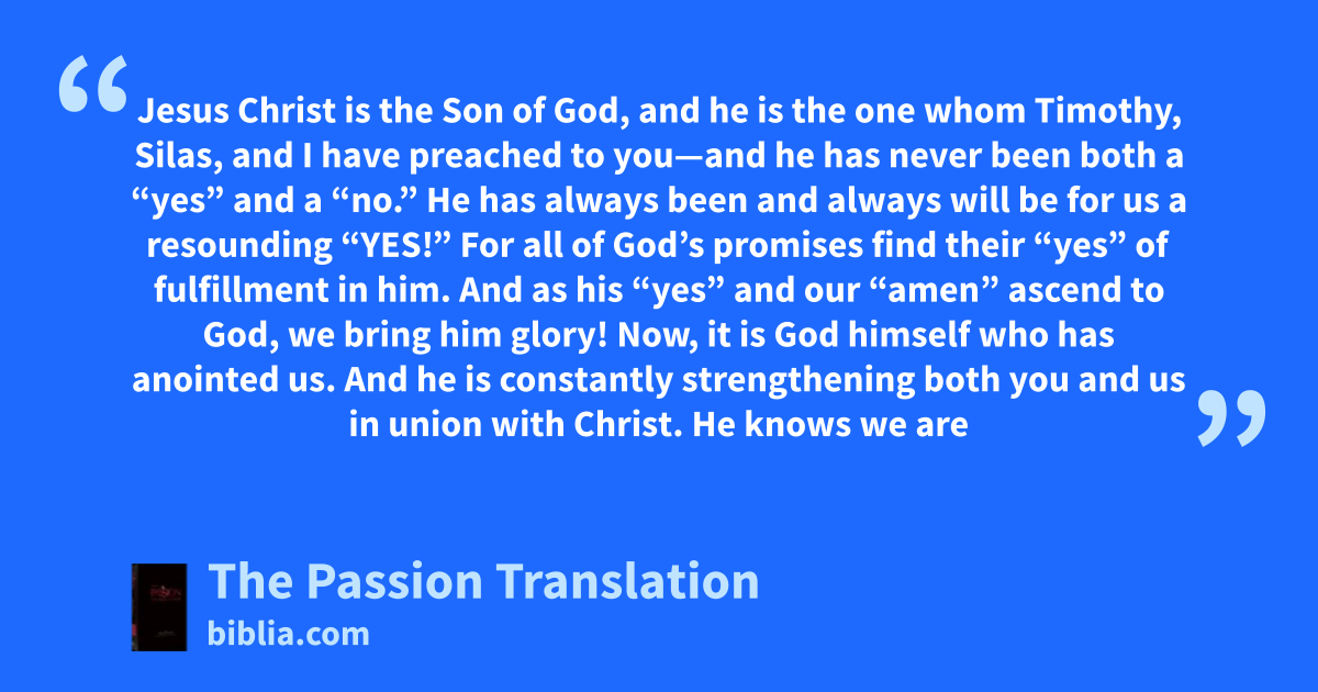 Jesus Christ is the Son of God, and he is the one whom Timothy, Silas, and I have preached to you—and he has never been both a “yes” and a “no.” He has always been and always will be for us a resounding “YES!” For all of God’s promises find their “yes” of fulfillment in him. And as his “yes” and our “amen” ascend to God, we bring him glory! Now, it is God himself who has anointed us. And he is constantly strengthening both you and us in union with Christ. He knows we are