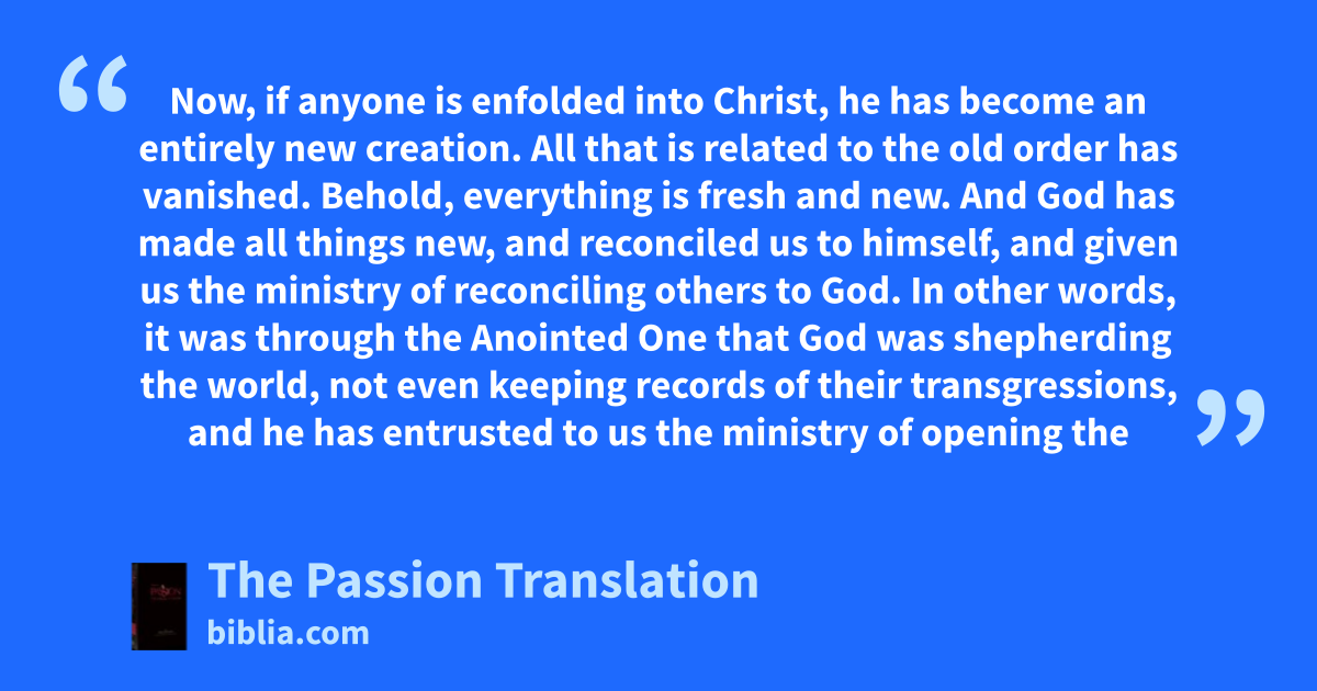 Now, if anyone is enfolded into Christ, he has become an entirely new creation. All that is related to the old order has vanished. Behold, everything is fresh and new. And God has made all things new, and reconciled us to himself, and given us the ministry of reconciling others to God. In other words, it was through the Anointed One that God was shepherding the world, not even keeping records of their transgressions, and he has entrusted to us the ministry of opening the