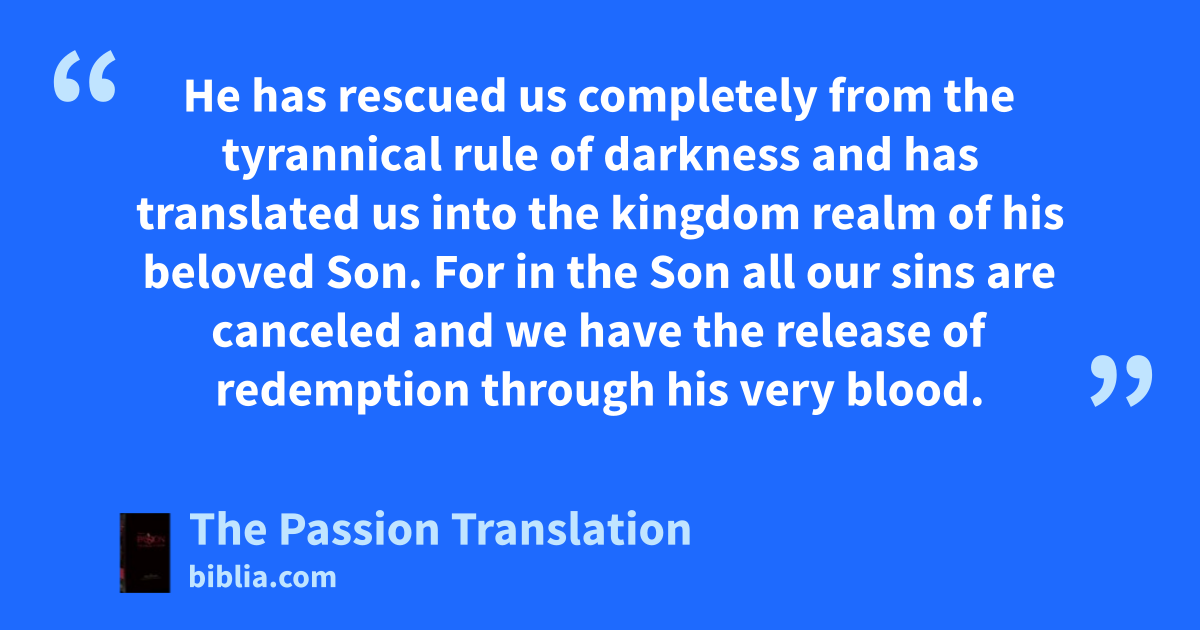He has rescued us completely from the tyrannical rule of darkness and has translated us into the kingdom realm of his beloved Son. For in the Son all our sins are canceled and we have the release of redemption through his very blood.