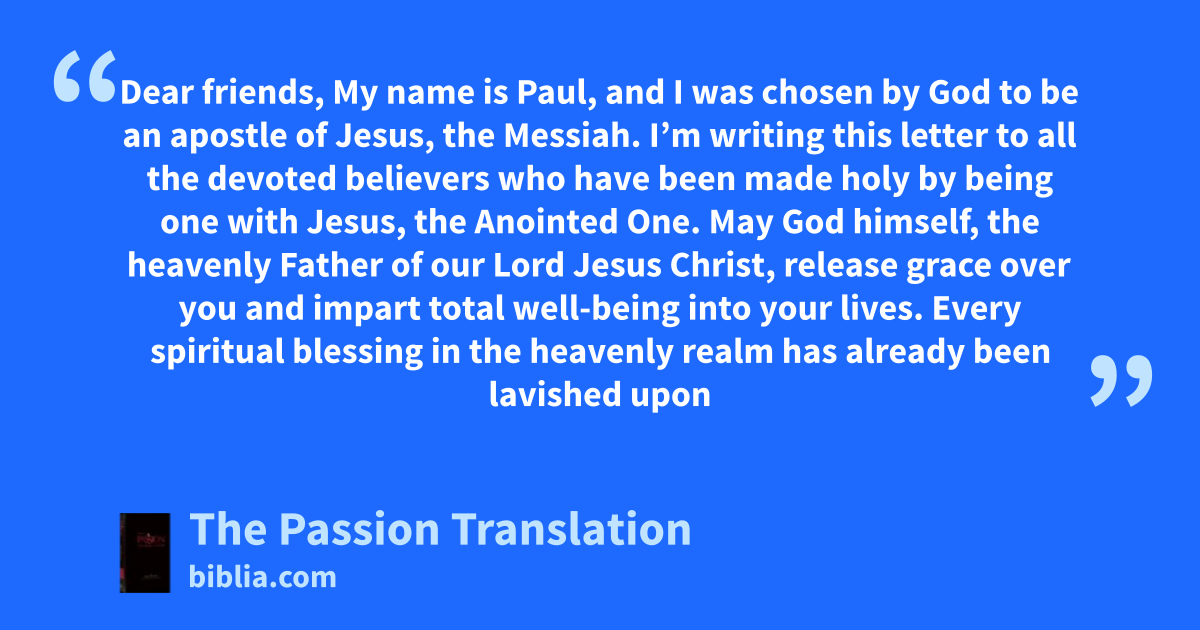 Dear friends, My name is Paul, and I was chosen by God to be an apostle of Jesus, the Messiah. I’m writing this letter to all the devoted believers who have been made holy by being one with Jesus, the Anointed One. May God himself, the heavenly Father of our Lord Jesus Christ, release grace over you and impart total well-being into your lives. Every spiritual blessing in the heavenly realm has already been lavished upon