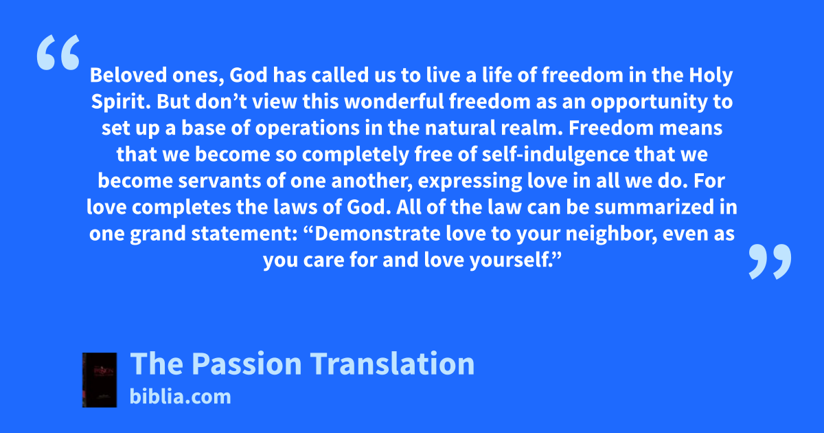 Beloved ones, God has called us to live a life of freedom in the Holy Spirit. But don’t view this wonderful freedom as an opportunity to set up a base of operations in the natural realm. Freedom means that we become so completely free of self-indulgence that we become servants of one another, expressing love in all we do. For love completes the laws of God. All of the law can be summarized in one grand statement: “Demonstrate love to your neighbor, even as you care for and love yourself.”