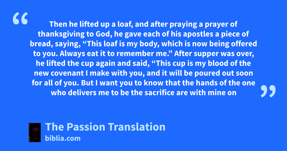 Then he lifted up a loaf, and after praying a prayer of thanksgiving to God, he gave each of his apostles a piece of bread, saying, “This loaf is my body, which is now being offered to you. Always eat it to remember me.” After supper was over, he lifted the cup again and said, “This cup is my blood of the new covenant I make with you, and it will be poured out soon for all of you. But I want you to know that the hands of the one who delivers me to be the sacrifice are with mine on