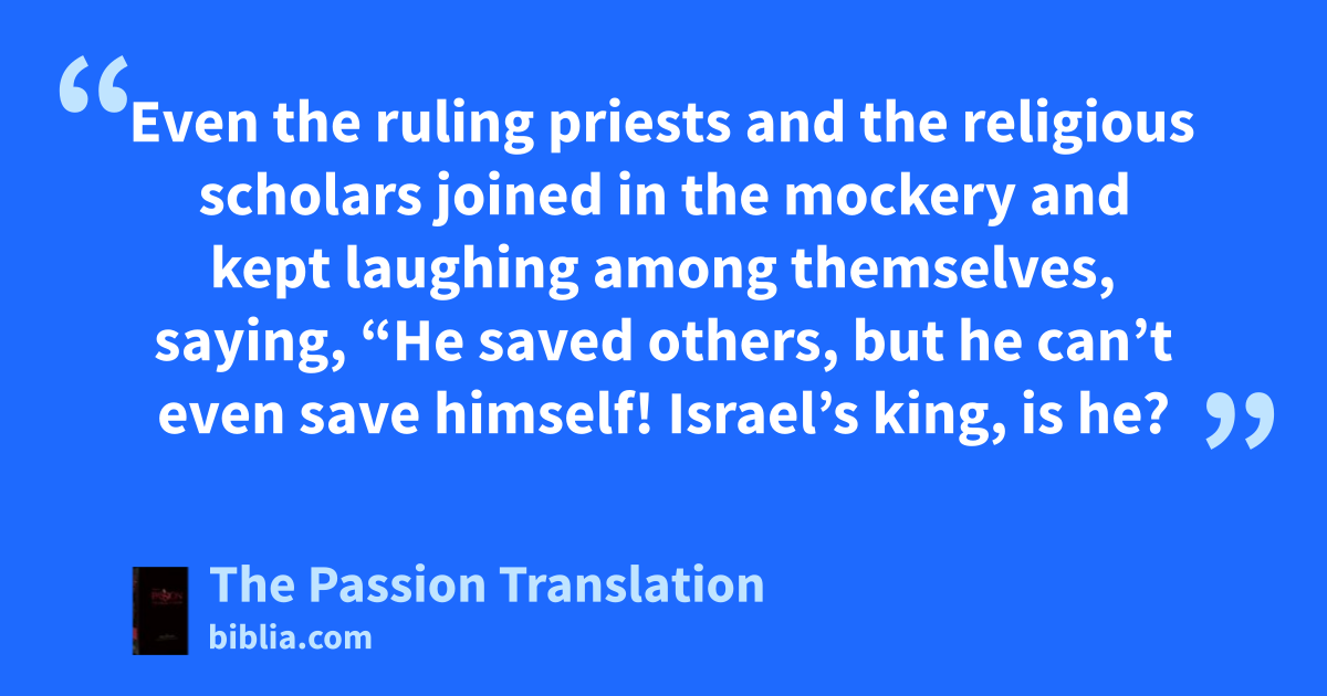 Even the ruling priests and the religious scholars joined in the mockery and kept laughing among themselves, saying, “He saved others, but he can’t even save himself! Israel’s king, is he?