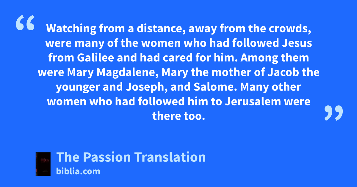 Watching from a distance, away from the crowds, were many of the women who had followed Jesus from Galilee and had cared for him. Among them were Mary Magdalene, Mary the mother of Jacob the younger and Joseph, and Salome. Many other women who had followed him to Jerusalem were there too.
