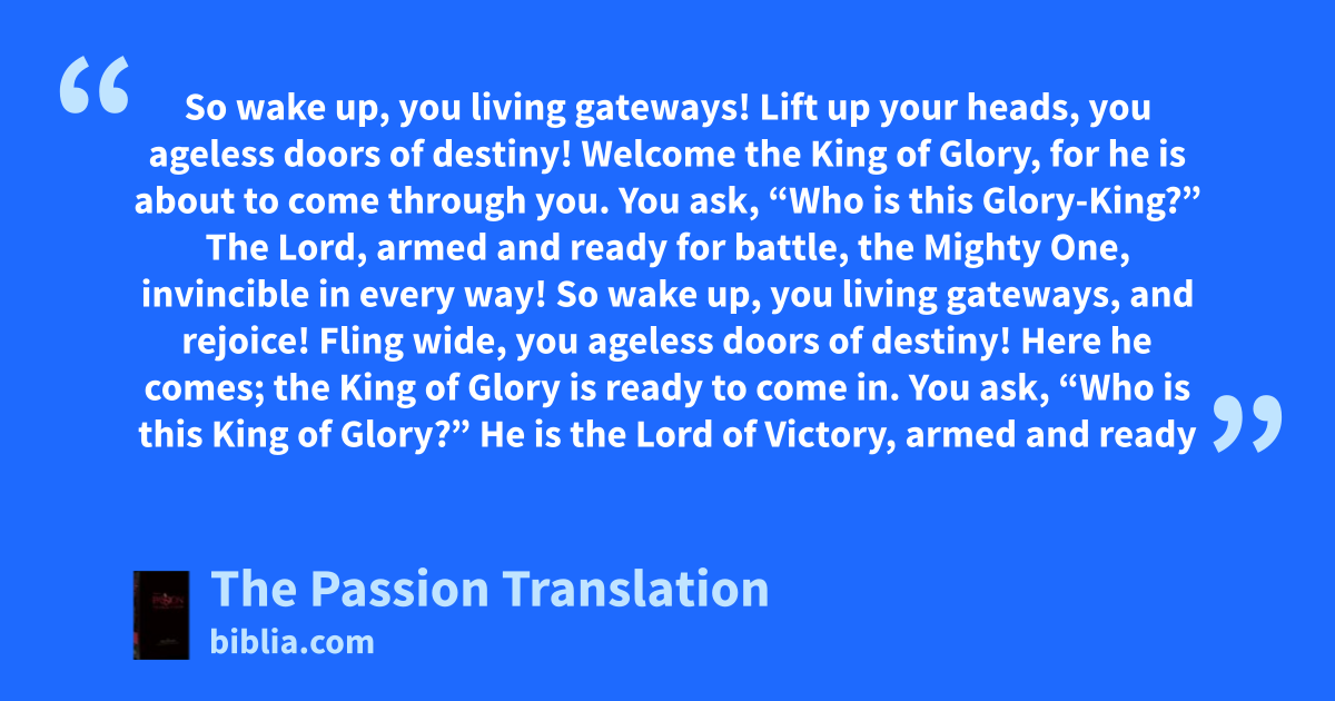 So wake up, you living gateways! Lift up your heads, you ageless doors of destiny! Welcome the King of Glory, for he is about to come through you. You ask, “Who is this Glory-King?” The Lord, armed and ready for battle, the Mighty One, invincible in every way! So wake up, you living gateways, and rejoice! Fling wide, you ageless doors of destiny! Here he comes; the King of Glory is ready to come in. You ask, “Who is this King of Glory?” He is the Lord of Victory, armed and ready