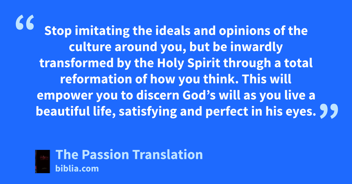 Stop imitating the ideals and opinions of the culture around you, but be inwardly transformed by the Holy Spirit through a total reformation of how you think. This will empower you to discern God’s will as you live a beautiful life, satisfying and perfect in his eyes.