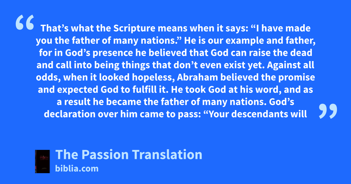 That’s what the Scripture means when it says: “I have made you the father of many nations.” He is our example and father, for in God’s presence he believed that God can raise the dead and call into being things that don’t even exist yet. Against all odds, when it looked hopeless, Abraham believed the promise and expected God to fulfill it. He took God at his word, and as a result he became the father of many nations. God’s declaration over him came to pass: “Your descendants will