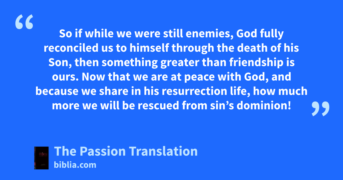 So if while we were still enemies, God fully reconciled us to himself through the death of his Son, then something greater than friendship is ours. Now that we are at peace with God, and because we share in his resurrection life, how much more we will be rescued from sin’s dominion!