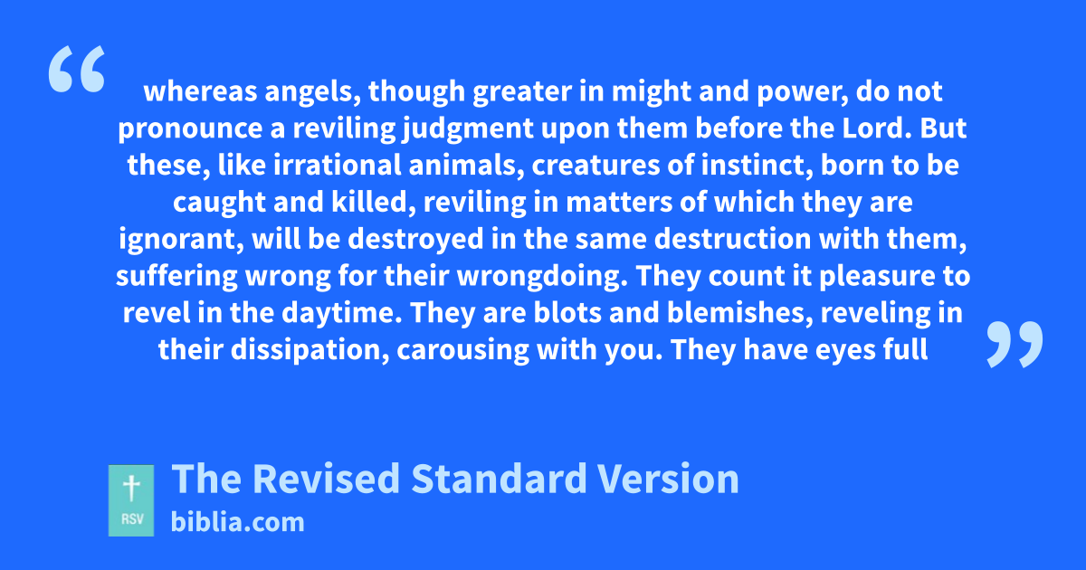 Bold and wilful, they are not afraid to revile the glorious ones, 11 whereas angels, though greater in might and power, do not pronounce a reviling judgment upon them before the Lord. 12 But these, like irrational animals, creatures of instinct, born to be caught and killed, reviling in matters of which they are ignorant, will be destroyed in the same destruction with them, 13 suffering wrong for their wrongdoing. They count it pleasure to revel in the daytime. They are blots and blemishes, reveling in their dissipation, carousing with you. 14 They have eyes full of adultery, insatiable for sin. They entice unsteady souls. They have hearts trained in greed. Accursed children! 15 Forsaking the right way they have gone astray; they have followed the way of Balaam, the son of Beor, who loved gain from wrongdoing, 16 but was rebuked for his own transgression; a dumb ass spoke with human voice and restrained the prophet’s madness.