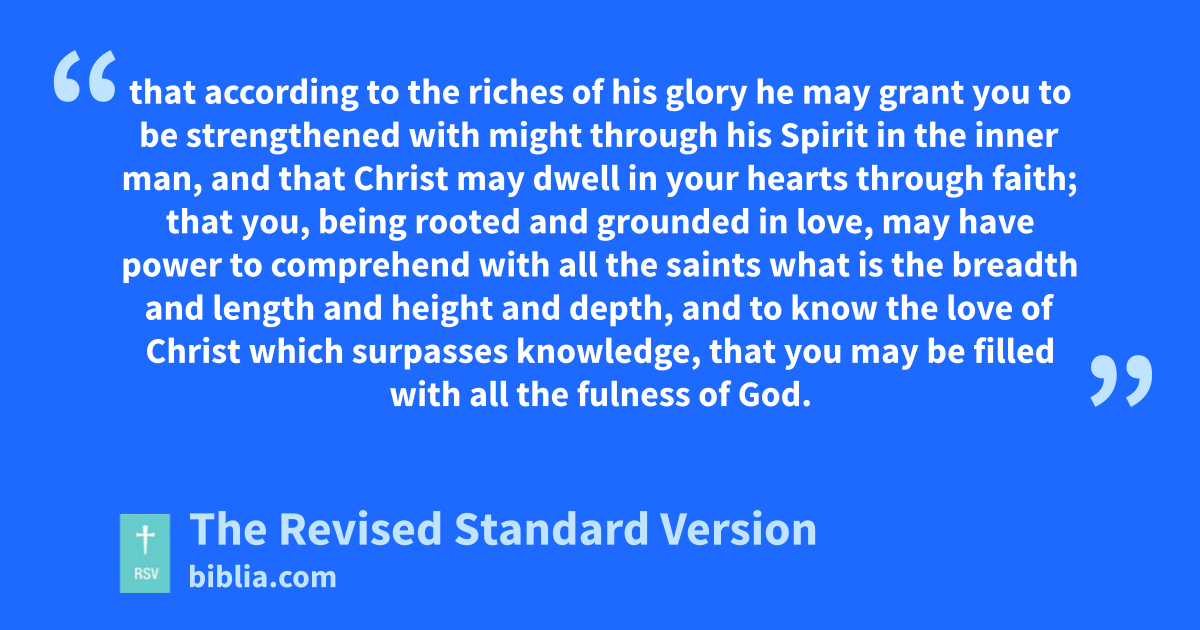 14 For this reason I bow my knees before the Father, 15 from whom every family in heaven and on earth is named, 16 that according to the riches of his glory he may grant you to be strengthened with might through his Spirit in the inner man, 17 and that Christ may dwell in your hearts through faith; that you, being rooted and grounded in love, 18 may have power to comprehend with all the saints what is the breadth and length and height and depth, 19 and to know the love of Christ which surpasses knowledge, that you may be filled with all the fulness of God.
