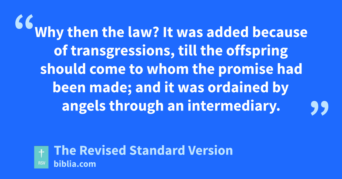 19 Why then the law? It was added because of transgressions, till the offspring should come to whom the promise had been made; and it was ordained by angels through an intermediary. 20 Now an intermediary implies more than one; but God is one.