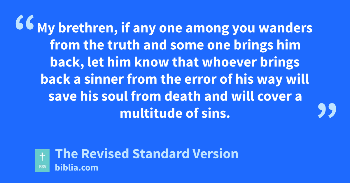 19 My brethren, if any one among you wanders from the truth and some one brings him back, 20 let him know that whoever brings back a sinner from the error of his way will save his soul from death and will cover a multitude of sins.
