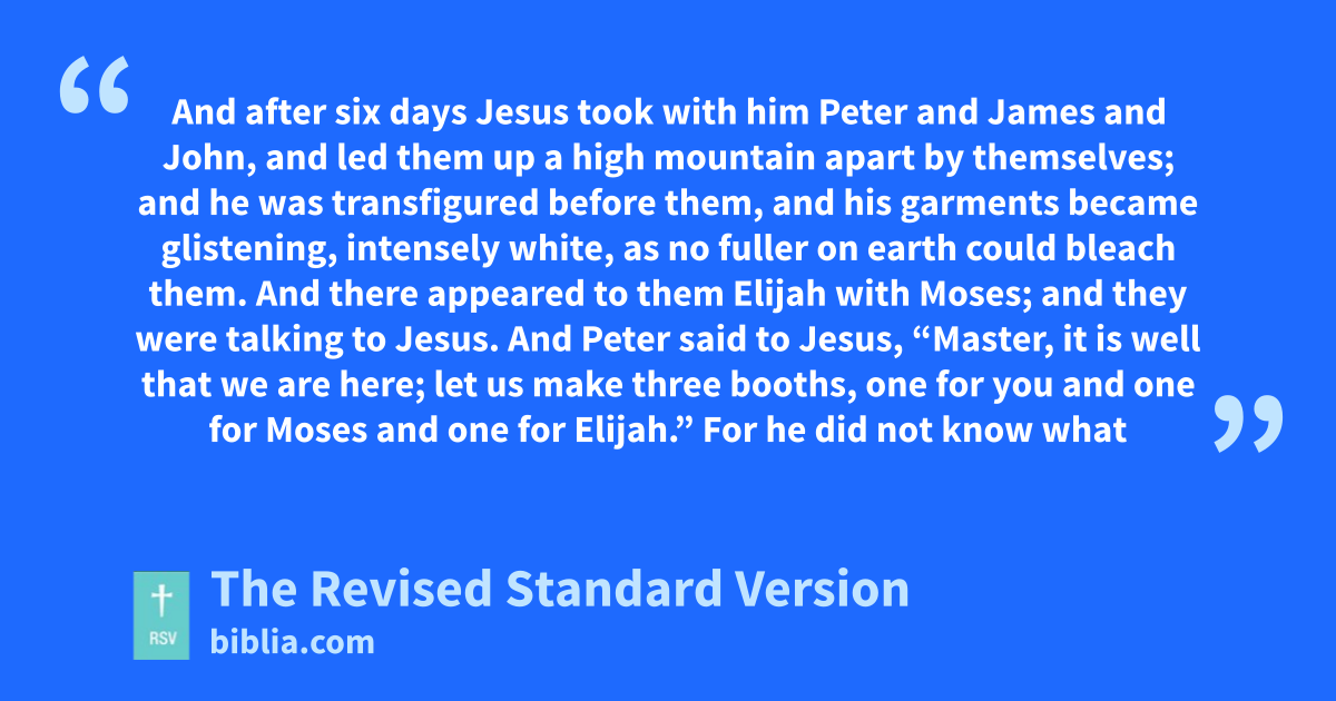 2 And after six days Jesus took with him Peter and James and John, and led them up a high mountain apart by themselves; and he was transfigured before them, 3 and his garments became glistening, intensely white, as no fuller on earth could bleach them. 4 And there appeared to them Elijah with Moses; and they were talking to Jesus. 5 And Peter said to Jesus, “Master, it is well that we are here; let us make three booths, one for you and one for Moses and one for Elijah.” 6 For he did not know what to say, for they were exceedingly afraid. 7 And a cloud overshadowed them, and a voice came out of the cloud, “This is my beloved Son; listen to him.” 8 And suddenly looking around they no longer saw any one with them but Jesus only.