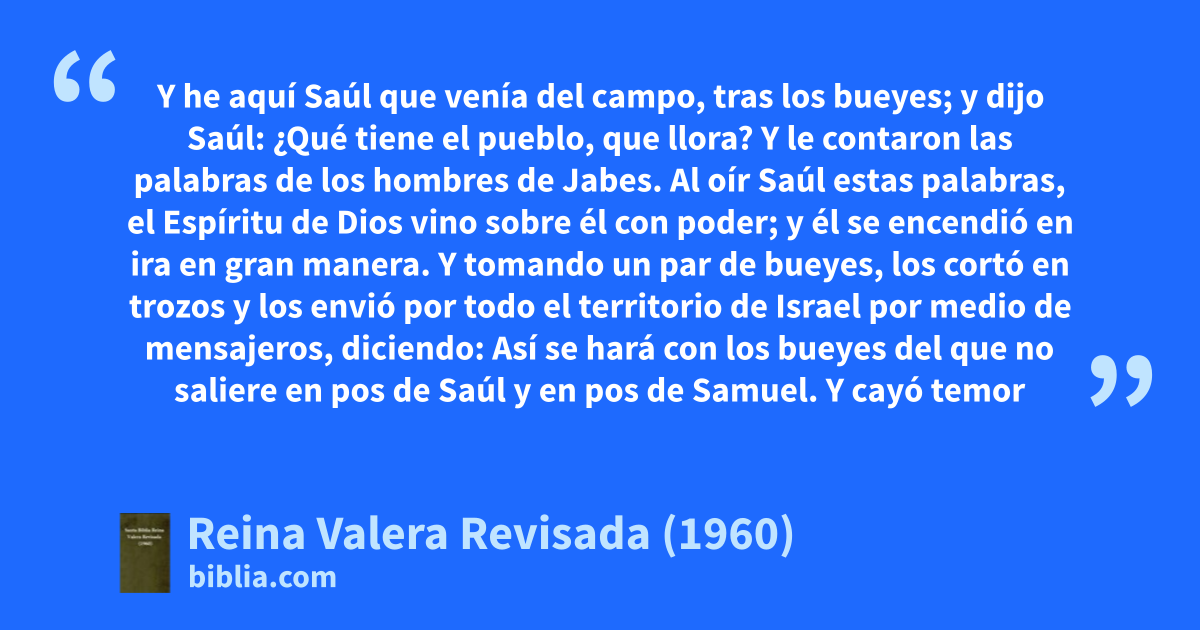 5Y he aquí Saúl que venía del campo, tras los bueyes; y dijo Saúl: ¿Qué tiene el pueblo, que llora? Y le contaron las palabras de los hombres de Jabes. 6Al oír Saúl estas palabras, el Espíritu de Dios vino sobre él con poder; y él se encendió en ira en gran manera. 7Y tomando un par de bueyes, los cortó en trozos y los envió por todo el territorio de Israel por medio de mensajeros, diciendo: Así se hará con los bueyes del que no saliere en pos de Saúl y en pos de Samuel. Y cayó temor de Jehová sobre el pueblo, y salieron como un solo hombre. 8Y los contó en Bezec; y fueron los hijos de Israel trescientos mil, y treinta mil los hombres de Judá. 9Y respondieron a los mensajeros que habían venido: Así diréis a los de Jabes de Galaad: Mañana al calentar el sol, seréis librados. Y vinieron los mensajeros y lo anunciaron a los de Jabes, los cuales se alegraron. 10Y los de Jabes dijeron a los enemigos: Mañana saldremos a vosotros, para que hagáis con nosotros todo lo que bien os pareciere. 11Aconteció que al día siguiente dispuso Saúl al pueblo en tres compañías, y entraron en medio del campamento a la vigilia de la mañana, e hirieron a los amonitas hasta que el día calentó; y los que quedaron fueron dispersos, de tal manera que no quedaron dos de ellos juntos.