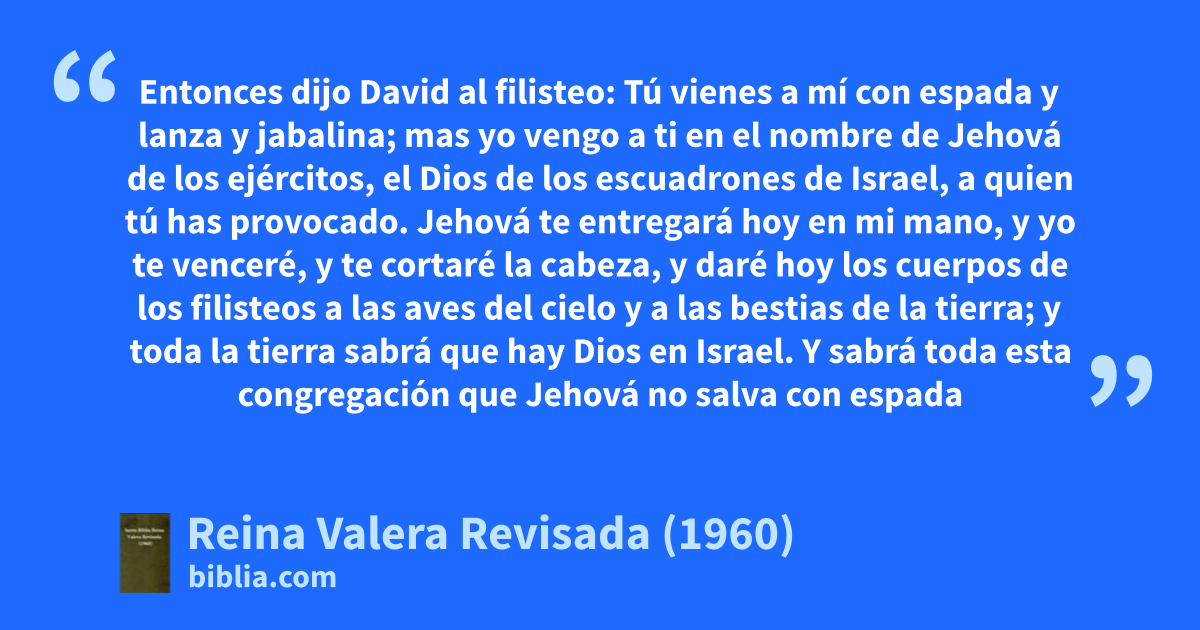41Y el filisteo venía andando y acercándose a David, y su escudero delante de él. 42Y cuando el filisteo miró y vio a David, le tuvo en poco; porque era muchacho, y rubio, y de hermoso parecer. 43Y dijo el filisteo a David: ¿Soy yo perro, para que vengas a mí con palos? Y maldijo a David por sus dioses. 44Dijo luego el filisteo a David: Ven a mí, y daré tu carne a las aves del cielo y a las bestias del campo. 45Entonces dijo David al filisteo: Tú vienes a mí con espada y lanza y jabalina; mas yo vengo a ti en el nombre de Jehová de los ejércitos, el Dios de los escuadrones de Israel, a quien tú has provocado. 46Jehová te entregará hoy en mi mano, y yo te venceré, y te cortaré la cabeza, y daré hoy los cuerpos de los filisteos a las aves del cielo y a las bestias de la tierra; y toda la tierra sabrá que hay Dios en Israel. 47Y sabrá toda esta congregación que Jehová no salva con espada y con lanza; porque de Jehová es la batalla, y él os entregará en nuestras manos.