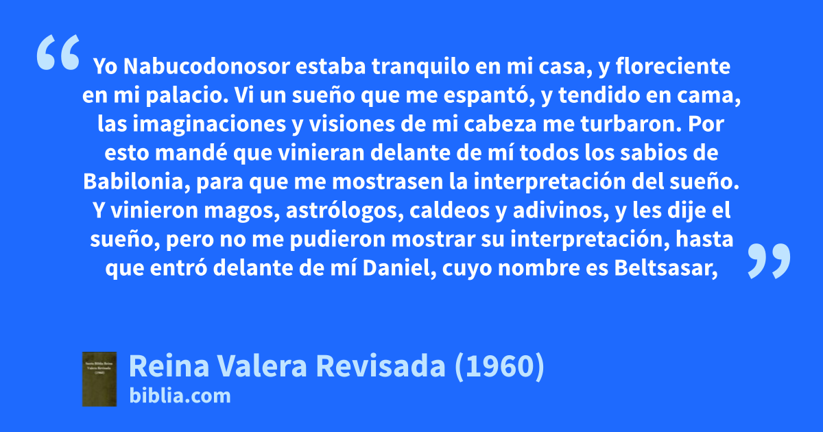 13Vi en las visiones de mi cabeza mientras estaba en mi cama, que he aquí un vigilante y santo descendía del cielo. 14Y clamaba fuertemente y decía así: Derribad el árbol, y cortad sus ramas, quitadle el follaje, y dispersad su fruto; váyanse las bestias que están debajo de él, y las aves de sus ramas. 15Mas la cepa de sus raíces dejaréis en la tierra, con atadura de hierro y de bronce entre la hierba del campo; sea mojado con el rocío del cielo, y con las bestias sea su parte entre la hierba de la tierra. 16Su corazón de hombre sea cambiado, y le sea dado corazón de bestia, y pasen sobre él siete tiempos. 17La sentencia es por decreto de los vigilantes, y por dicho de los santos la resolución, para que conozcan los vivientes que el Altísimo gobierna el reino de los hombres, y que a quien él quiere lo da, y constituye sobre él al más bajo de los hombres. 18Yo el rey Nabucodonosor he visto este sueño. Tú, pues, Beltsasar, dirás la interpretación de él, porque todos los sabios de mi reino no han podido mostrarme su interpretación; mas tú puedes, porque mora en ti el espíritu de los dioses santos.