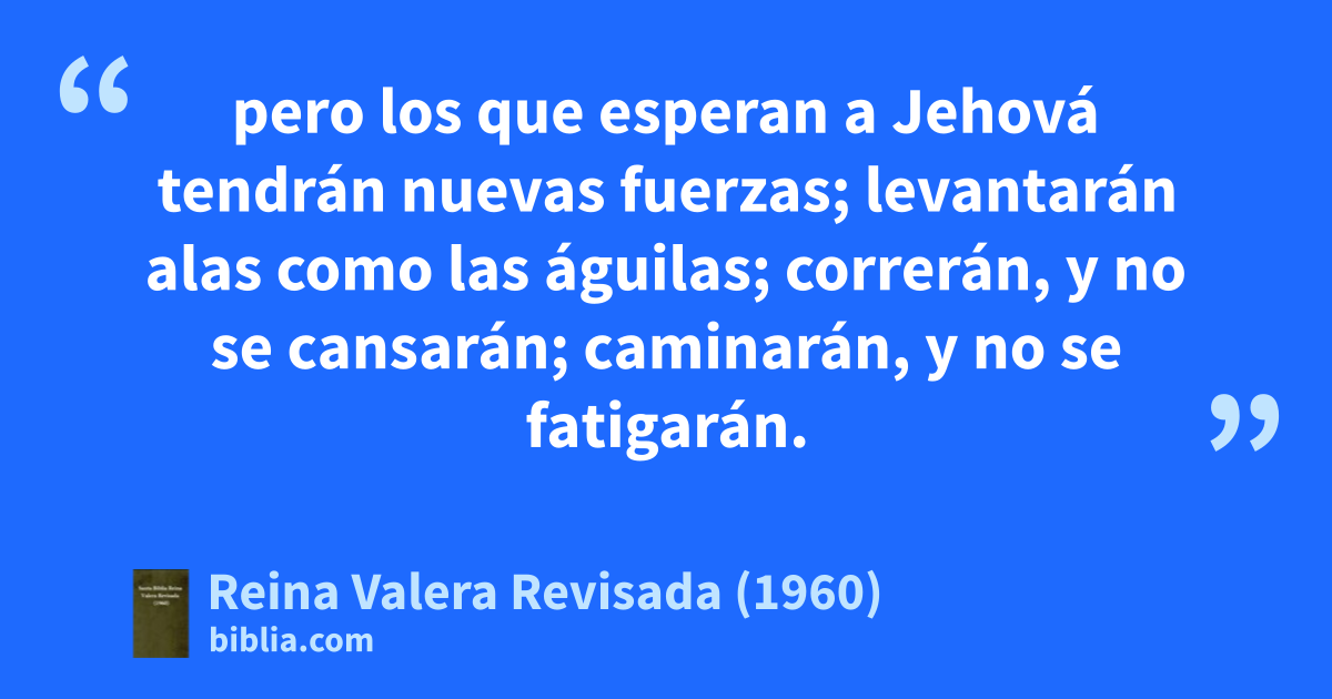27¿Por qué dices, oh Jacob, y hablas tú, Israel: Mi camino está escondido de Jehová, y de mi Dios pasó mi juicio? 28¿No has sabido, no has oído que el Dios eterno es Jehová, el cual creó los confines de la tierra? No desfallece, ni se fatiga con cansancio, y su entendimiento no hay quien lo alcance. 29El da esfuerzo al cansado, y multiplica las fuerzas al que no tiene ningunas. 30Los muchachos se fatigan y se cansan, los jóvenes flaquean y caen; 31pero los que esperan a Jehová tendrán nuevas fuerzas; levantarán alas como las águilas; correrán, y no se cansarán; caminarán, y no se fatigarán.