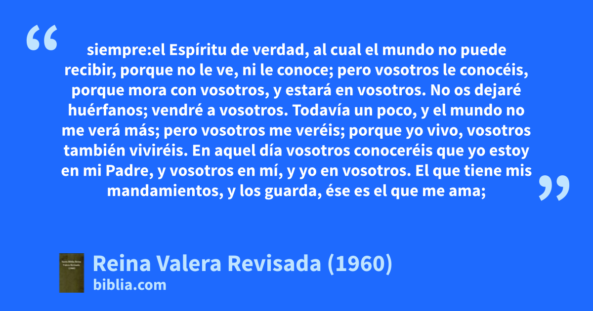 15Si me amáis, guardad mis mandamientos. 16Y yo rogaré al Padre, y os dará otro Consolador, para que esté con vosotros para siempre: 17el Espíritu de verdad, al cual el mundo no puede recibir, porque no le ve, ni le conoce; pero vosotros le conocéis, porque mora con vosotros, y estará en vosotros.