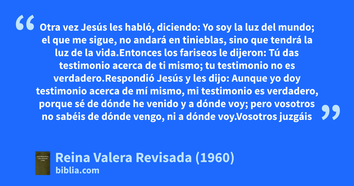 12Otra vez Jesús les habló, diciendo: Yo soy la luz del mundo;b el que me sigue, no andará en tinieblas, sino que tendrá la luz de la vida. 13Entonces los fariseos le dijeron: Tú das testimonio acerca de ti mismo; tu testimonio no es verdadero.c 14Respondió Jesús y les dijo: Aunque yo doy testimonio acerca de mí mismo, mi testimonio es verdadero, porque sé de dónde he venido y a dónde voy; pero vosotros no sabéis de dónde vengo, ni a dónde voy. 15Vosotros juzgáis según la carne; yo no juzgo a nadie. 16Y si yo juzgo, mi juicio es verdadero; porque no soy yo solo, sino yo y el que me envió, el Padre. 17Y en vuestra ley está escrito que el testimonio de dos hombres es verdadero. 18Yo soy el que doy testimonio de mí mismo, y el Padre que me envió da testimonio de mí. 19Ellos le dijeron: ¿Dónde está tu Padre? Respondió Jesús: Ni a mí me conocéis, ni a mi Padre; si a mí me conocieseis, también a mi Padre conoceríais. 20Estas palabras habló Jesús en el lugar de las ofrendas, enseñando en el templo; y nadie le prendió, porque aún no había llegado su hora.
