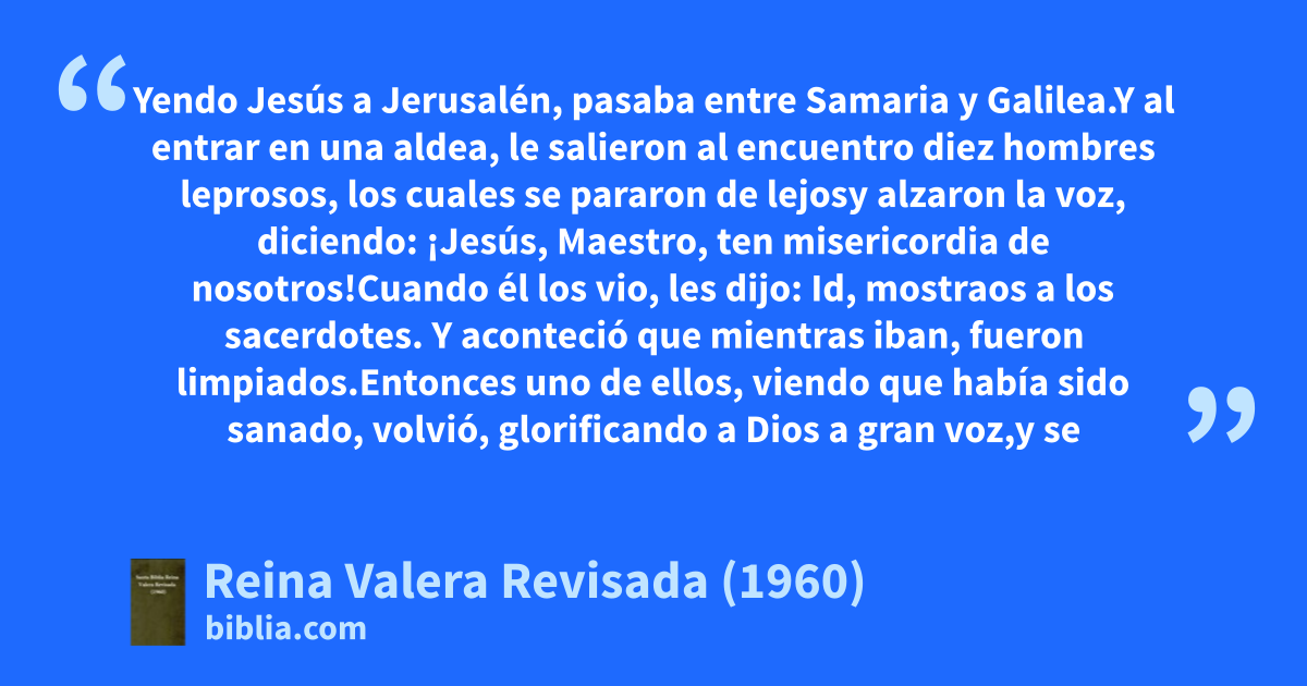 11Yendo Jesús a Jerusalén, pasaba entre Samaria y Galilea. 12Y al entrar en una aldea, le salieron al encuentro diez hombres leprosos, los cuales se pararon de lejos 13y alzaron la voz, diciendo: ¡Jesús, Maestro, ten misericordia de nosotros! 14Cuando él los vio, les dijo: Id, mostraos a los sacerdotes.b Y aconteció que mientras iban, fueron limpiados. 15Entonces uno de ellos, viendo que había sido sanado, volvió, glorificando a Dios a gran voz, 16y se postró rostro en tierra a sus pies, dándole gracias; y éste era samaritano. 17Respondiendo Jesús, dijo: ¿No son diez los que fueron limpiados? Y los nueve, ¿dónde están? 18¿No hubo quien volviese y diese gloria a Dios sino este extranjero? 19Y le dijo: Levántate, vete; tu fe te ha salvado.