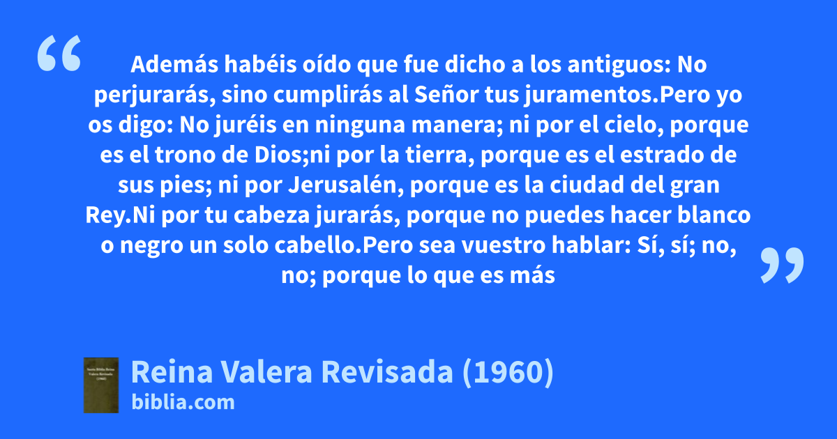 33Además habéis oído que fue dicho a los antiguos: No perjurarás,s sino cumplirás al Señor tus juramentos.t 34Pero yo os digo: No juréis en ninguna manera;u ni por el cielo, porque es el trono de Dios;v 35ni por la tierra, porque es el estrado de sus pies;w ni por Jerusalén, porque es la ciudad del gran Rey.x 36Ni por tu cabeza jurarás, porque no puedes hacer blanco o negro un solo cabello. 37Pero sea vuestro hablar: Sí, sí; no, no; porque lo que es más de esto, de mal procede.