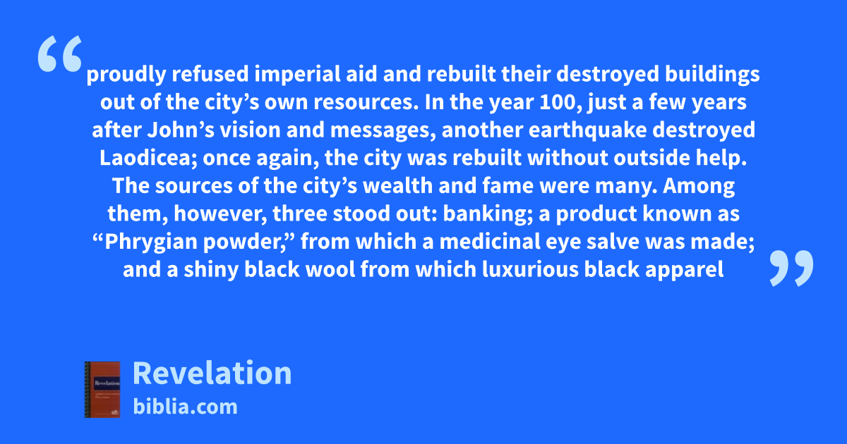 proudly refused imperial aid and rebuilt their destroyed buildings out of the city’s own resources. In the year 100, just a few years after John’s vision and messages, another earthquake destroyed Laodicea; once again, the city was rebuilt without outside help. The sources of the city’s wealth and fame were many. Among them, however, three stood out: banking; a product known as “Phrygian powder,” from which a medicinal eye salve was made; and a shiny black wool from which luxurious black apparel