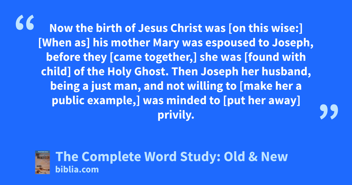 Now the birth of Jesus Christ was [on this wise:] [When as] his mother Mary was espoused to Joseph, before they [came together,] she was [found with child] of the Holy Ghost. Then Joseph her husband, being a just man, and not willing to [make her a public example,] was minded to [put her away] privily.