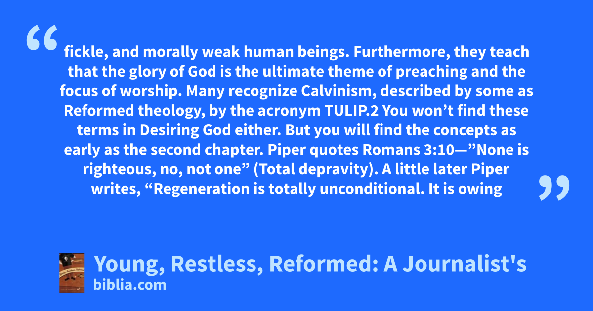 From places like John Piper's den, Al Mohler's office, and Jonathan Edwards's college, Christianity Today journalist Collin Hansen investigates what makes today's young Calvinists tick. Church-growth strategies and charismatic worship have fueled the bulk of evangelical growth in America for decades. While baby boomers have flocked to churches that did not look or sound like church, it seems...