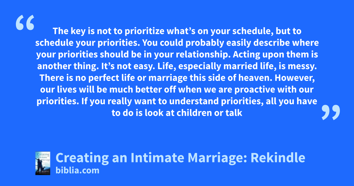 The key is not to prioritize what’s on your schedule, but to schedule your priorities. You could probably easily describe where your priorities should be in your relationship. Acting upon them is another thing. It’s not easy. Life, especially married life, is messy. There is no perfect life or marriage this side of heaven. However, our lives will be much better off when we are proactive with our priorities. If you really want to understand priorities, all you have to do is look at children or talk