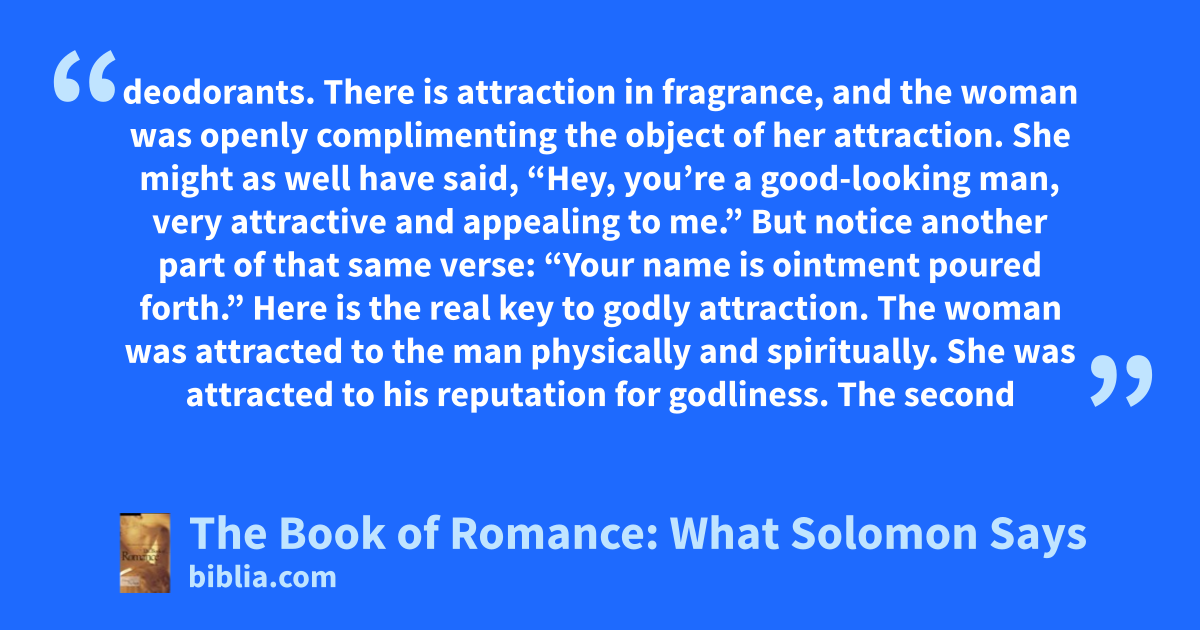 deodorants. There is attraction in fragrance, and the woman was openly complimenting the object of her attraction. She might as well have said, “Hey, you’re a good-looking man, very attractive and appealing to me.” But notice another part of that same verse: “Your name is ointment poured forth.” Here is the real key to godly attraction. The woman was attracted to the man physically and spiritually. She was attracted to his reputation for godliness. The second