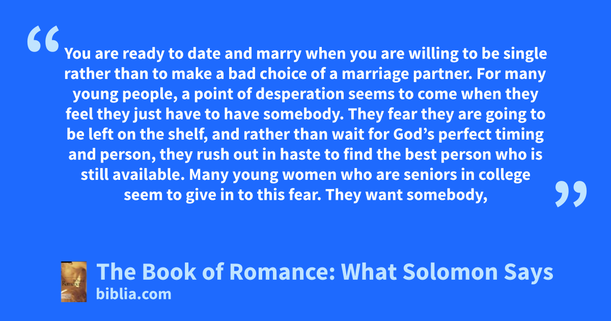 You are ready to date and marry when you are willing to be single rather than to make a bad choice of a marriage partner. For many young people, a point of desperation seems to come when they feel they just have to have somebody. They fear they are going to be left on the shelf, and rather than wait for God’s perfect timing and person, they rush out in haste to find the best person who is still available. Many young women who are seniors in college seem to give in to this fear. They want somebody,