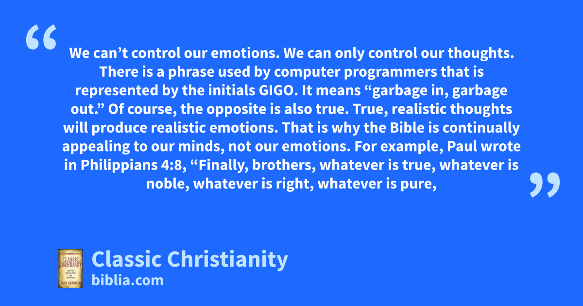 We can’t control our emotions. We can only control our thoughts. There is a phrase used by computer programmers that is represented by the initials GIGO. It means “garbage in, garbage out.” Of course, the opposite is also true. True, realistic thoughts will produce realistic emotions. That is why the Bible is continually appealing to our minds, not our emotions. For example, Paul wrote in Philippians 4:8, “Finally, brothers, whatever is true, whatever is noble, whatever is right, whatever is pure,