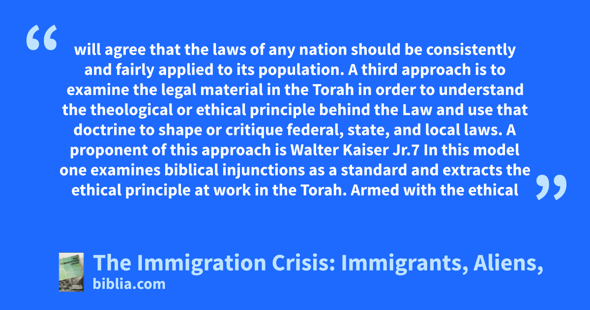 will agree that the laws of any nation should be consistently and fairly applied to its population. A third approach is to examine the legal material in the Torah in order to understand the theological or ethical principle behind the Law and use that doctrine to shape or critique federal, state, and local laws. A proponent of this approach is Walter Kaiser Jr.7 In this model one examines biblical injunctions as a standard and extracts the ethical principle at work in the Torah. Armed with the ethical