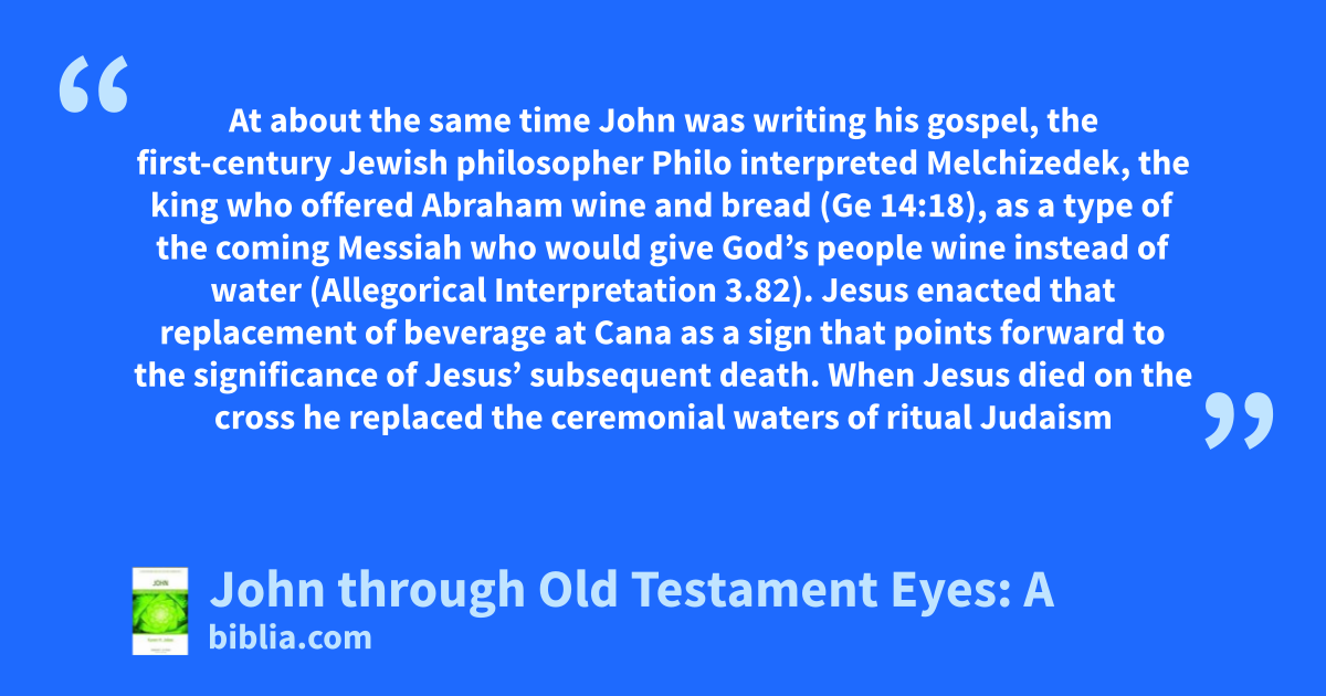 At about the same time John was writing his gospel, the first-century Jewish philosopher Philo interpreted Melchizedek, the king who offered Abraham wine and bread (Ge 14:18), as a type of the coming Messiah who would give God’s people wine instead of water (Allegorical Interpretation 3.82). Jesus enacted that replacement of beverage at Cana as a sign that points forward to the significance of Jesus’ subsequent death. When Jesus died on the cross he replaced the ceremonial waters of ritual Judaism
