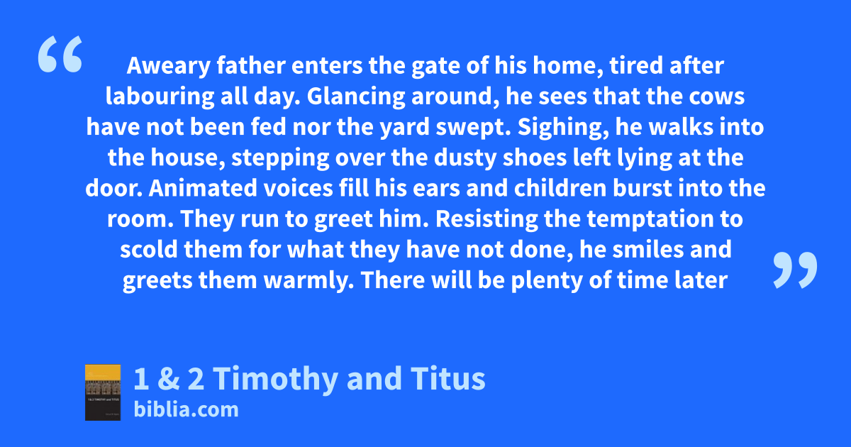 Aweary father enters the gate of his home, tired after labouring all day. Glancing around, he sees that the cows have not been fed nor the yard swept. Sighing, he walks into the house, stepping over the dusty shoes left lying at the door. Animated voices fill his ears and children burst into the room. They run to greet him. Resisting the temptation to scold them for what they have not done, he smiles and greets them warmly. There will be plenty of time later