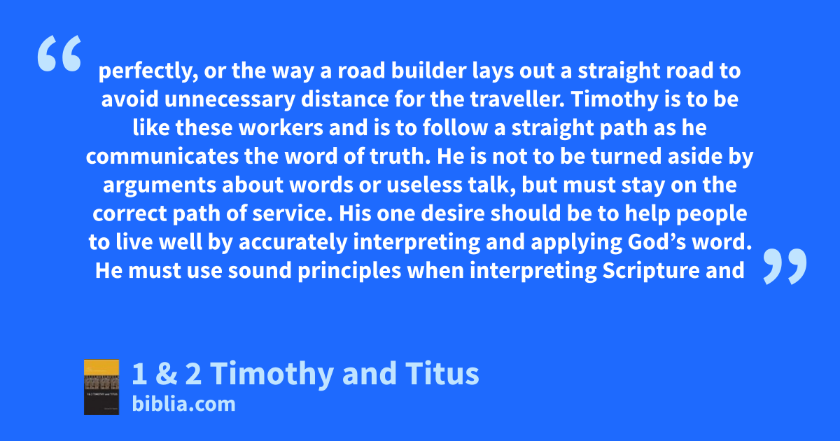 perfectly, or the way a road builder lays out a straight road to avoid unnecessary distance for the traveller. Timothy is to be like these workers and is to follow a straight path as he communicates the word of truth. He is not to be turned aside by arguments about words or useless talk, but must stay on the correct path of service. His one desire should be to help people to live well by accurately interpreting and applying God’s word. He must use sound principles when interpreting Scripture and